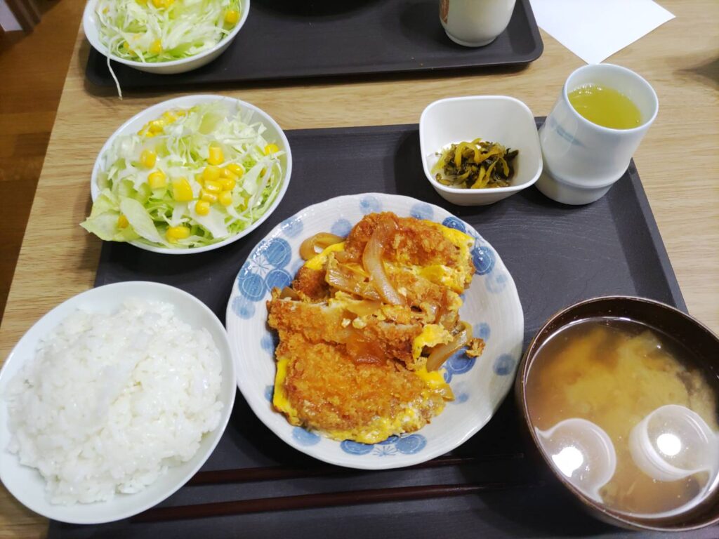 2025/10/23 夕食 ごはん かつ煮 サラダ 高菜 味噌汁