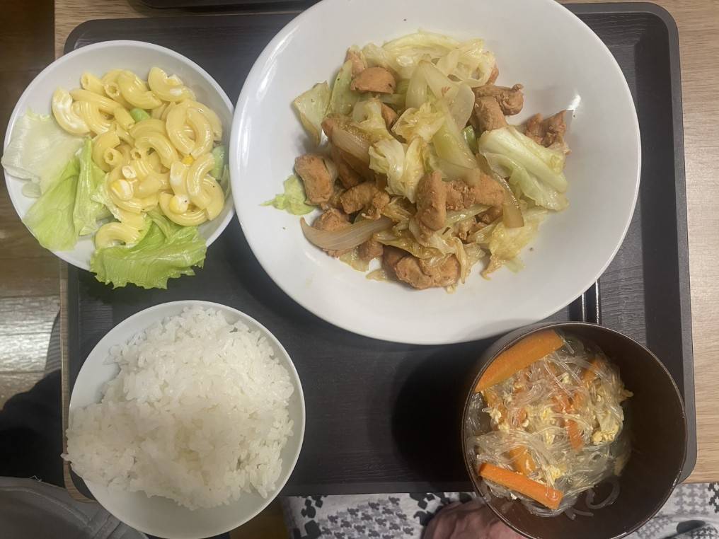 2025/02/17 夕食 ごはん 焼きそば 春キャベツとマカロニサラダ 漬物 中華スープ