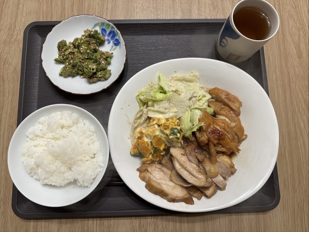 2025/10/25 夕食 ご飯 照り焼きチキン かぼちゃサラダ オクラの胡麻和え