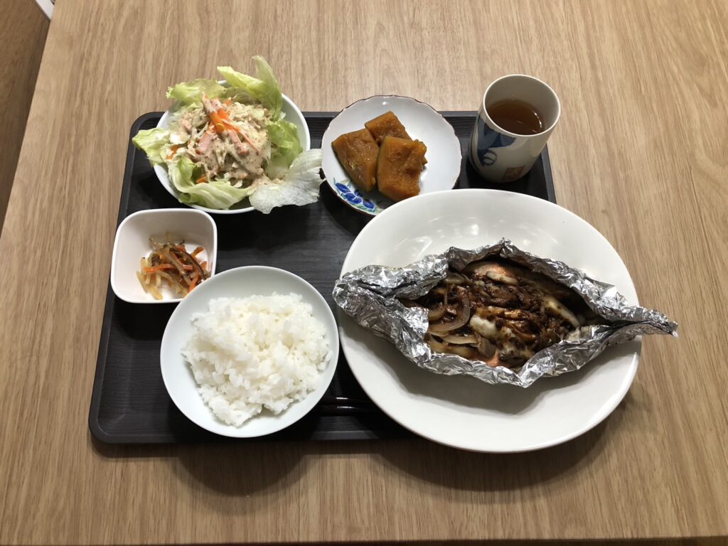 2025/10/24 夕食 ご飯 鮭ときのこのホイル焼き かぼちゃ煮付け サラダ きんぴらゴボウ