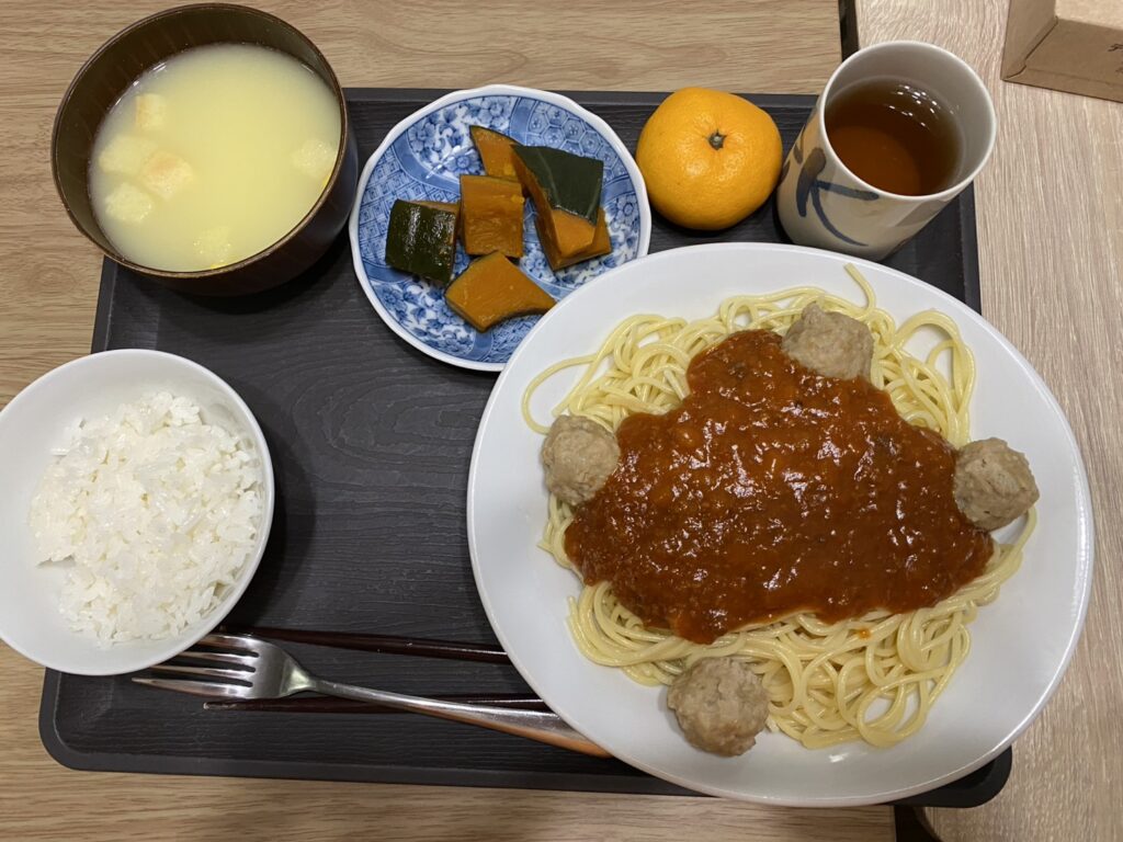 2025/10/20 夕食 ごはん ミートスパゲティー かぼちゃ煮物 みかん コーンスープ
