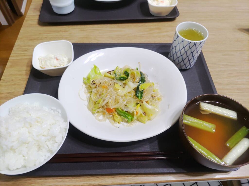 2025/04/03 夕食 ごはん 焼きビーフン サラダ ほうれん草胡麻和え