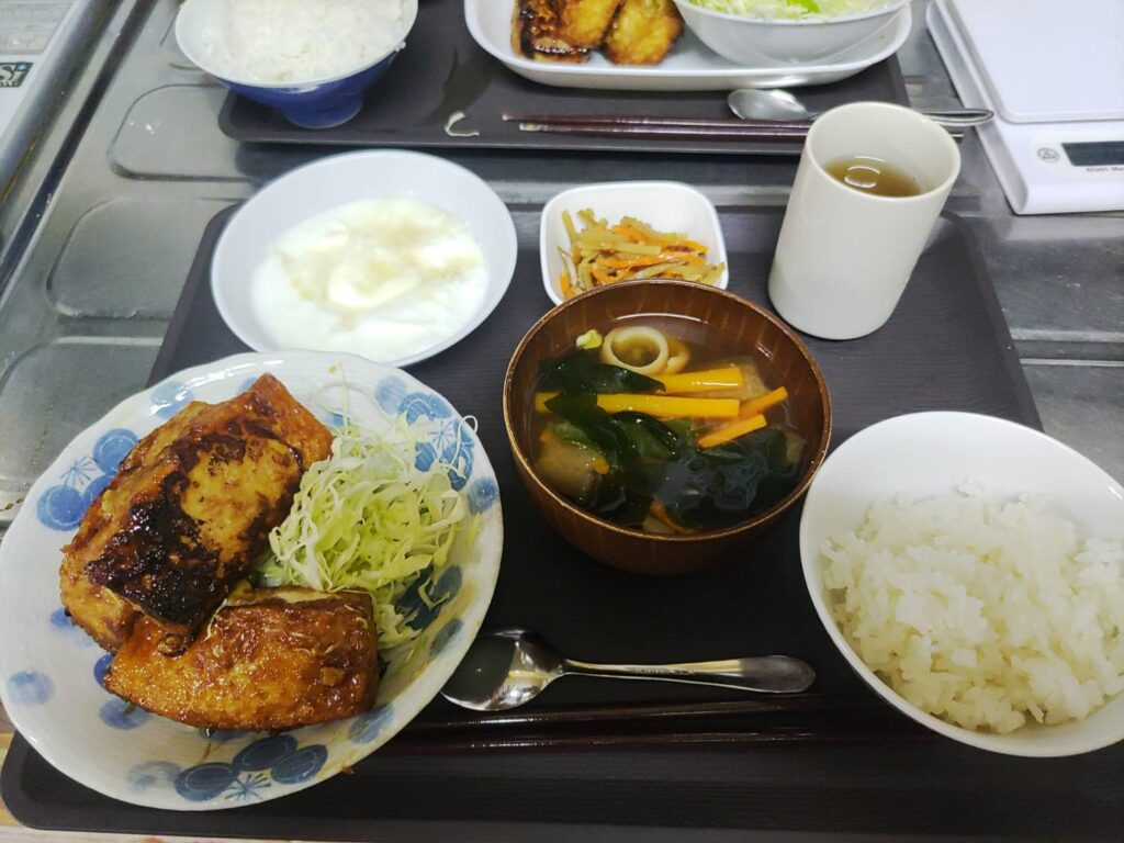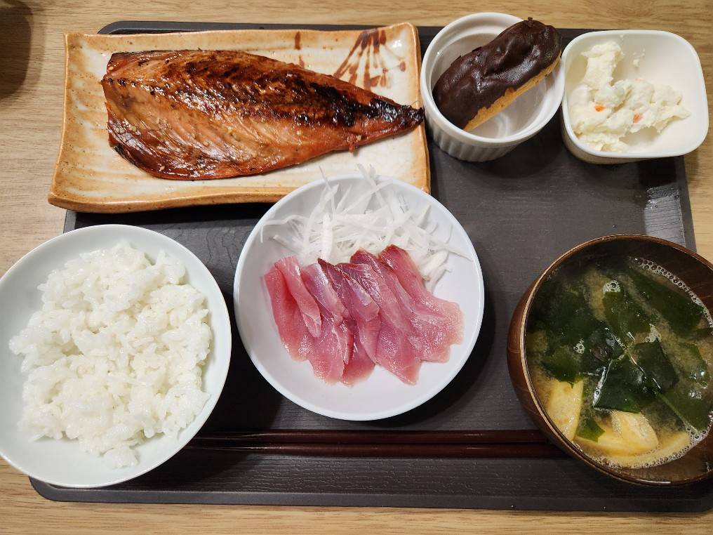 2025/11/23 夕食 ご飯 味噌汁 鯖のみりん干し 刺身(ぶり) ポテトサラダ エクレア