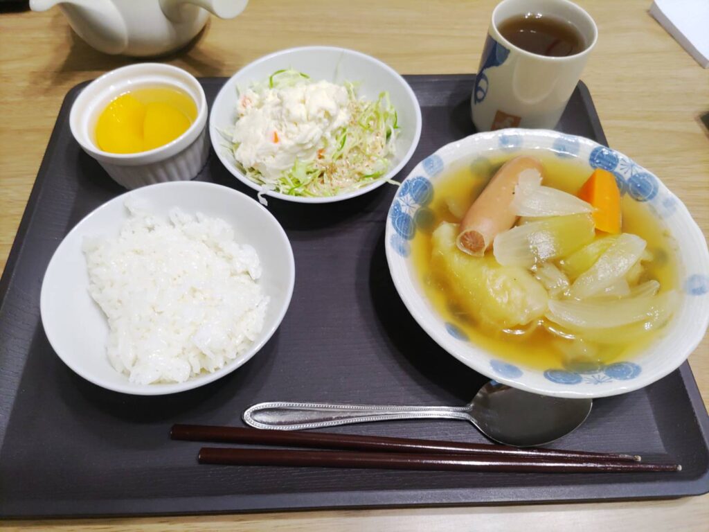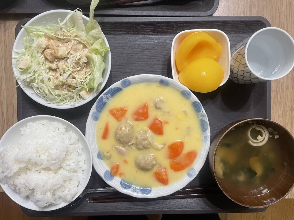 2025/11/04 夕食 ごはん シチュー サラダ 味噌汁 桃の缶詰