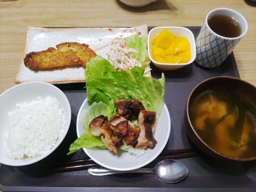 2025/11/27 夕食 白身魚のパン粉焼き チキンステーキ きんぴらサラダ マンゴー ごはん 味噌汁