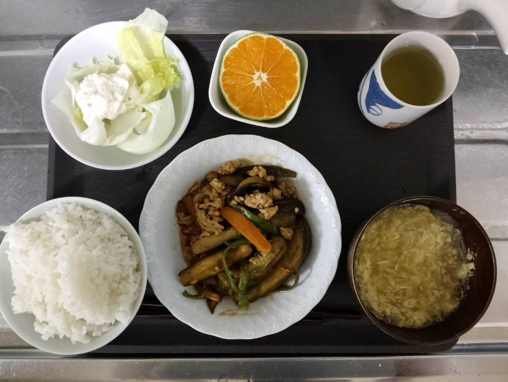 2025/10/29 夕食 ご飯・麻婆茄子・ポテトサラダ・みかん・中華スープ