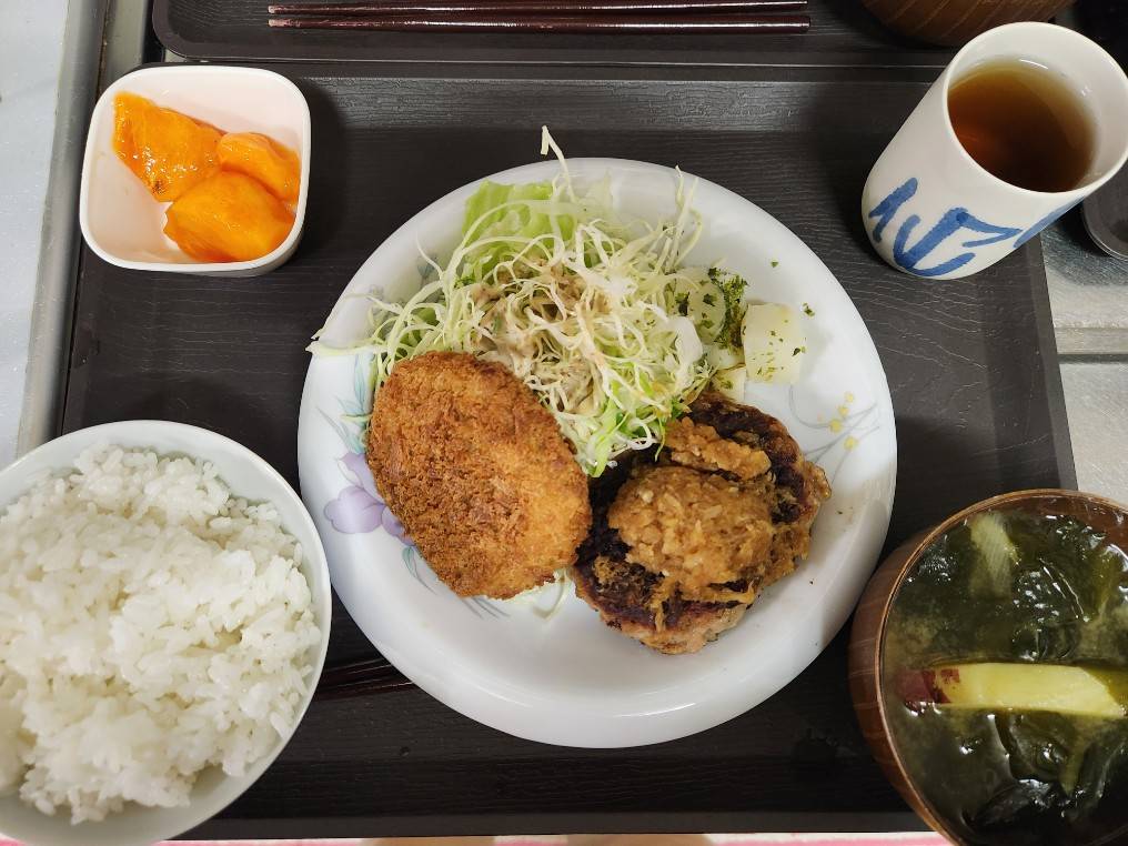2025/10/31 夕食 ご飯 味噌汁 おろしハンバーグ かぼちゃコロッケ サラダ こふきいも 柿