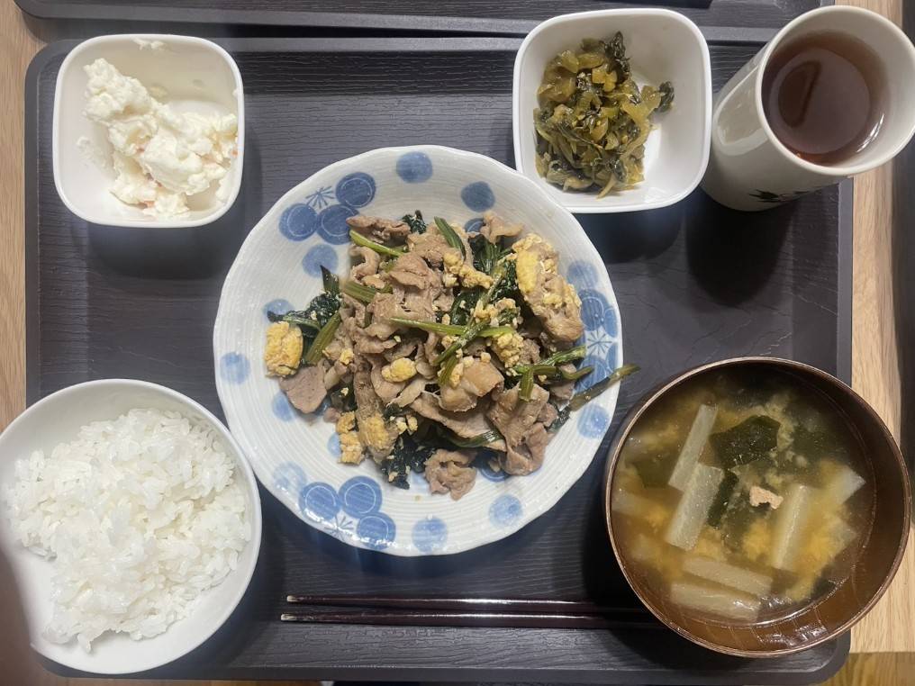 2025/11/11 夕食 ごはん 味噌汁 豚肉とほうれん草の中華炒め 高菜 サラダ