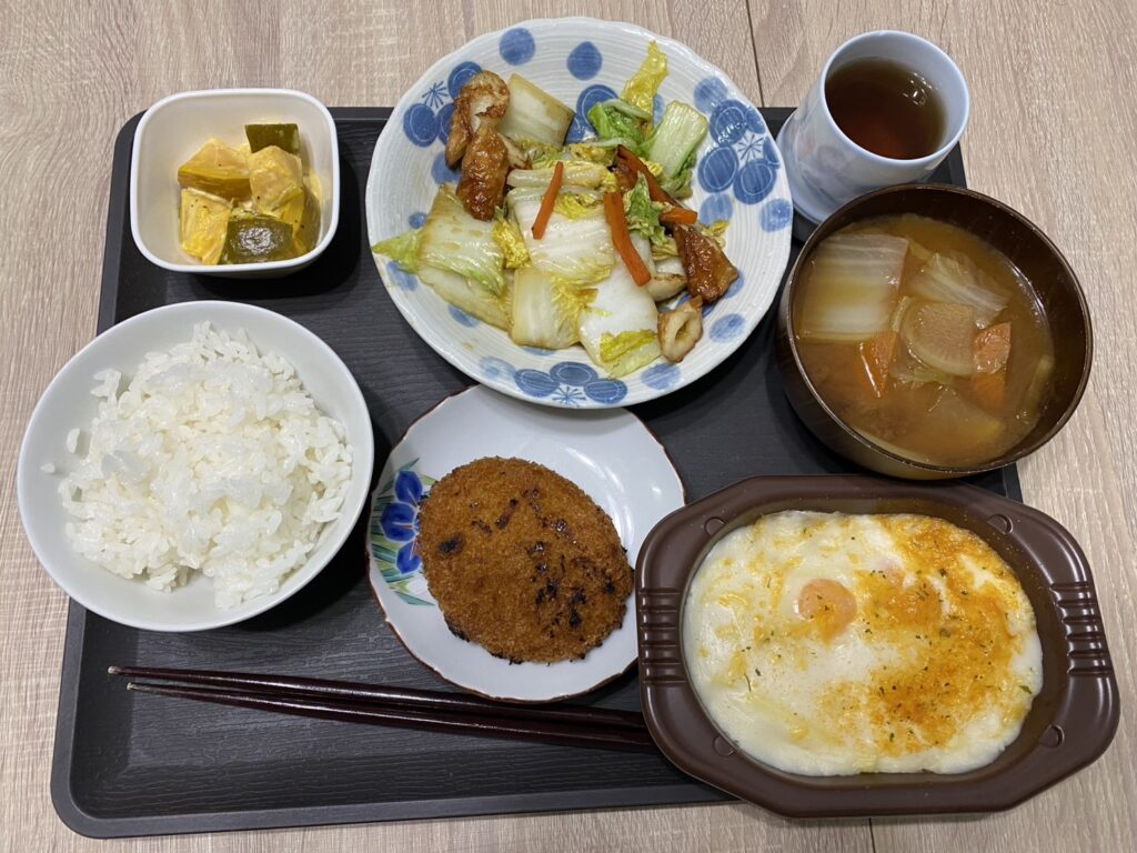 2025/11/26 夕食 ごはん グラタン コロッケ ちくわと白菜の生姜炒め かぼちゃサラダ 味噌汁