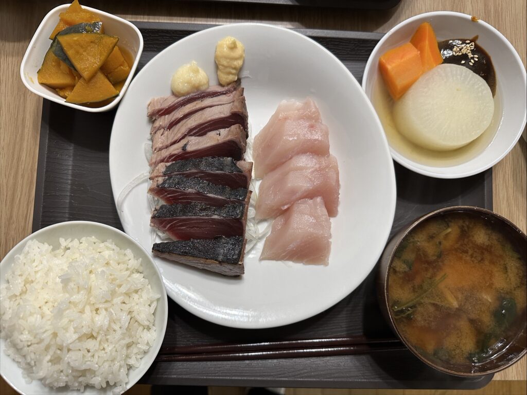 2025/11/08 夕食 ご飯 味噌汁 鰹のタタキ きはだまぐろのお刺身 ふろふき大根 かぼちゃの煮物