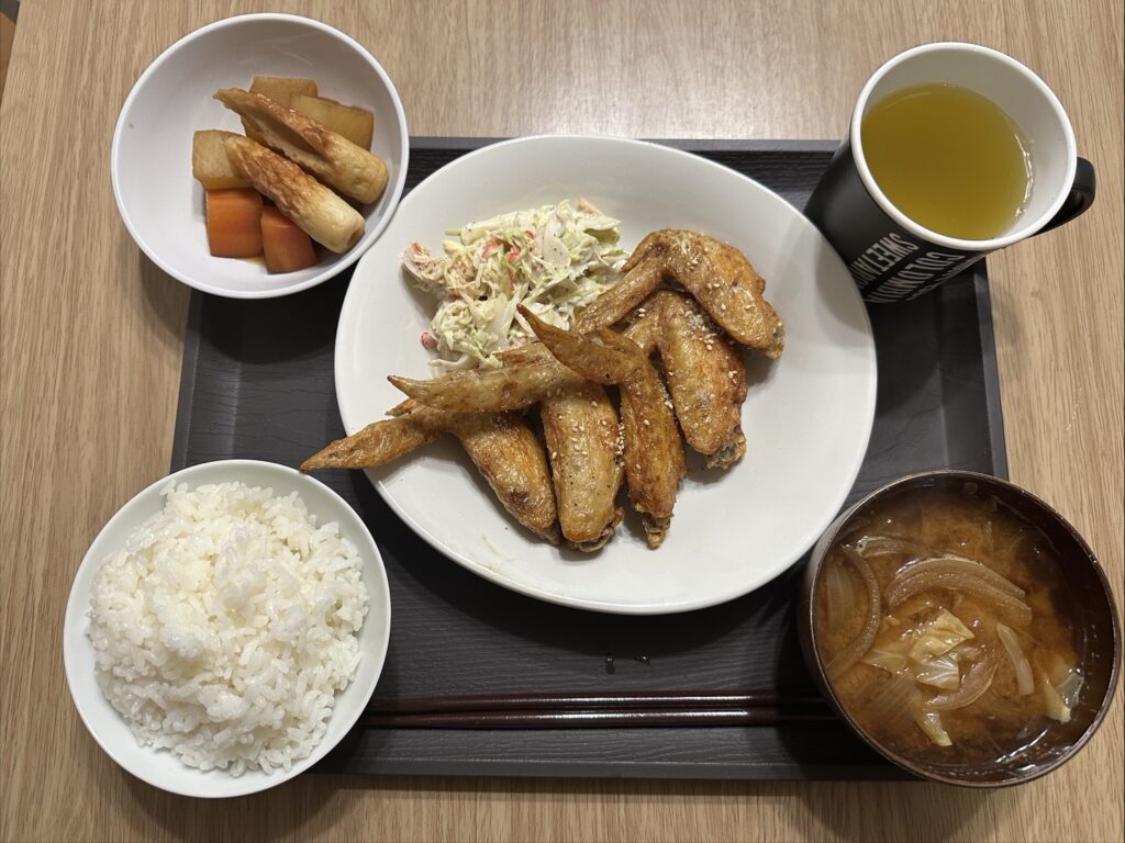 ご飯 味噌汁 手羽先 大根とちくわの煮物 サラダ