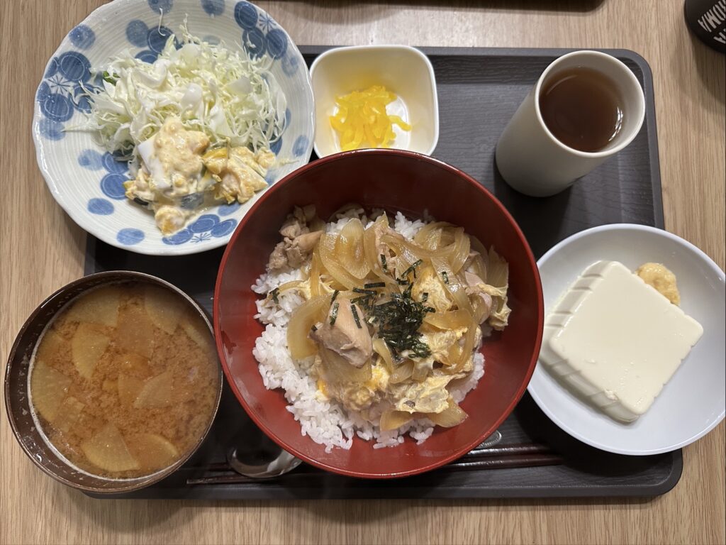2025/11/22 夕食 親子丼 味噌汁 冷奴 かぼちゃサラダ 漬け物