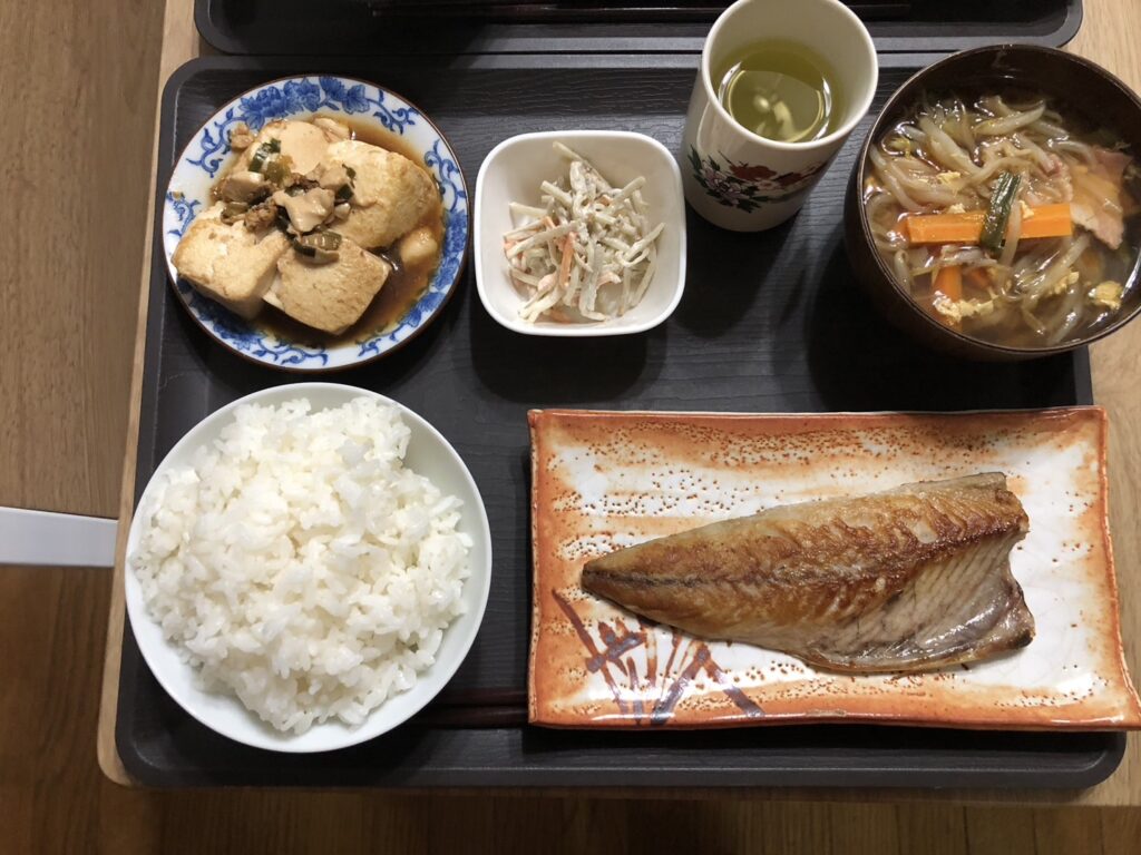 2025/10/30 夕食 ごはん みそ汁 鯖の塩焼き ごぼうサラダ 豆腐の炒め煮