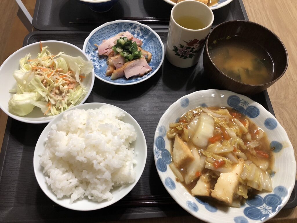 2025/11/07 ご飯 味噌汁 白菜と厚揚げの旨煮 スモークチキン サラダ リンゴ