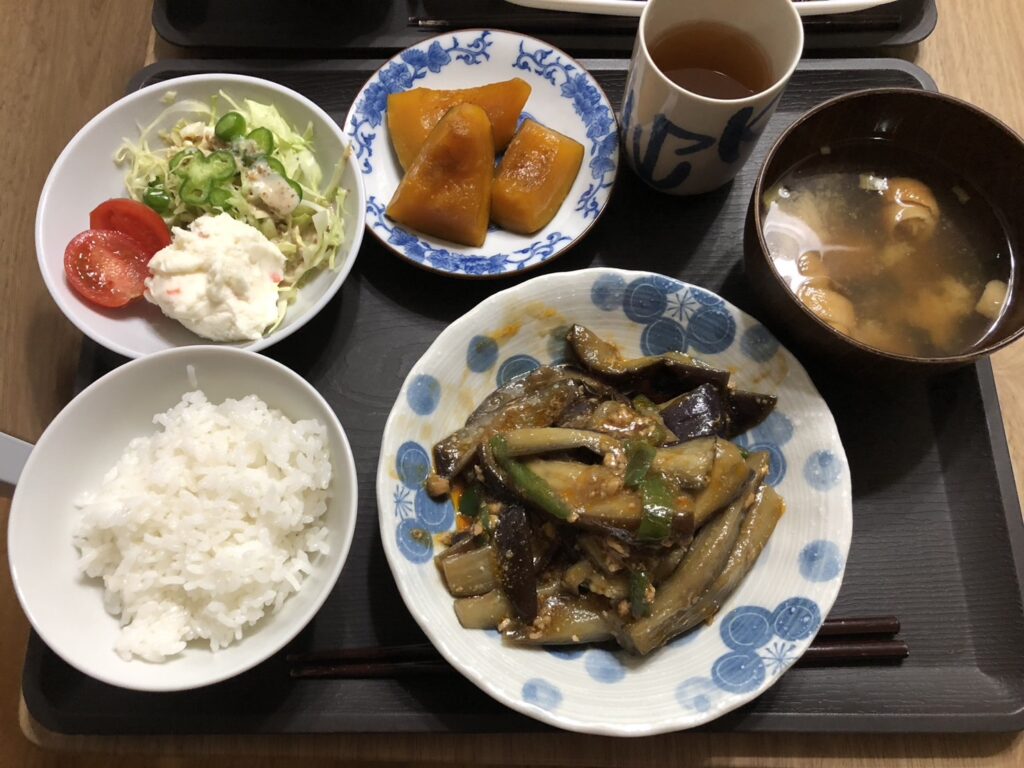 2025/11/14 夕食 ご飯 味噌汁 麻婆茄子 かぼちゃの煮つけ サラダ