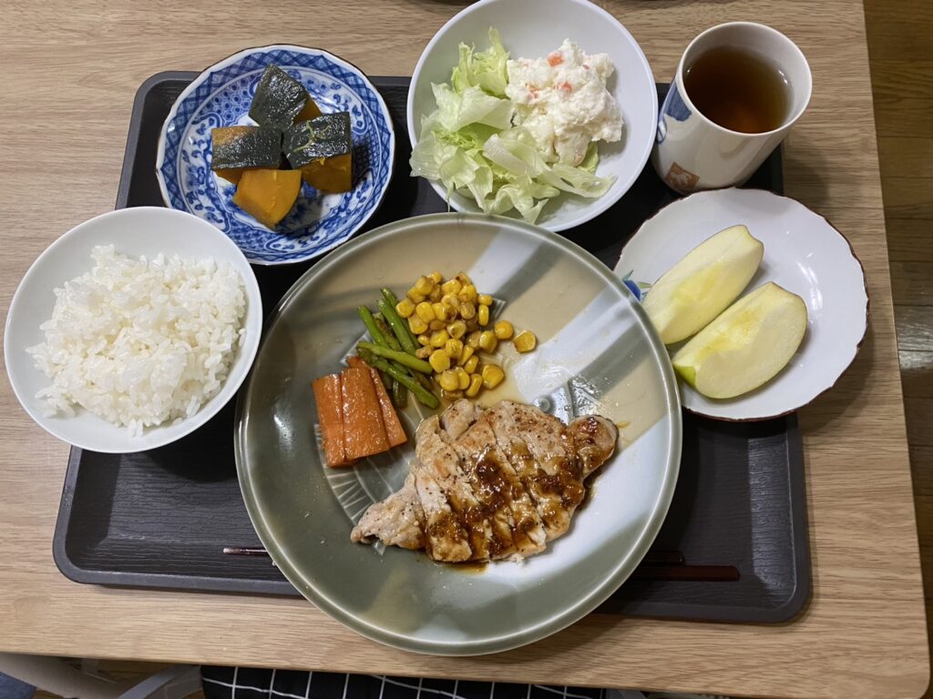 2025/11/05 夕食 ごはん トンテキ かぼちゃ煮物 サラダ りんご