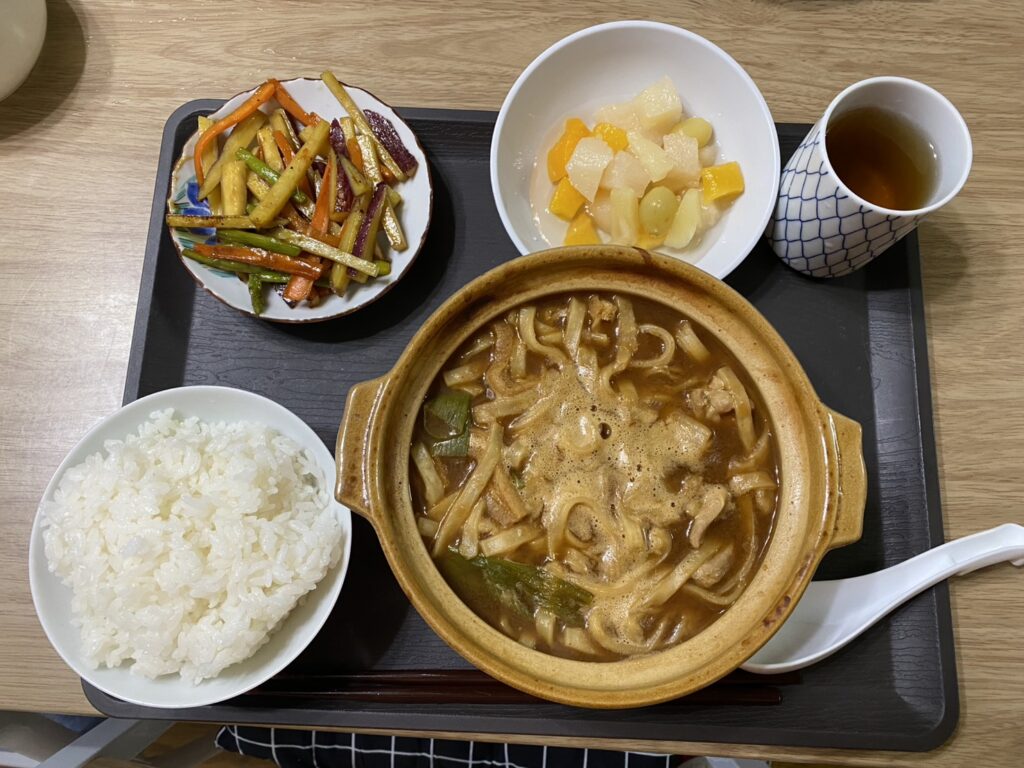 2025/11/12 夕食 ごはん 味噌煮込みうどん サツマイモきんぴら フルーツポンチ