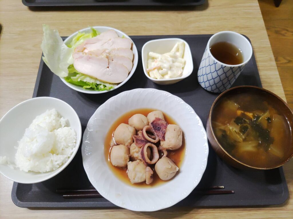 2025/12/04 夕食 イカと里芋の煮物 スモークチキンのサラダ マカロニサラダ ごはん 味噌汁