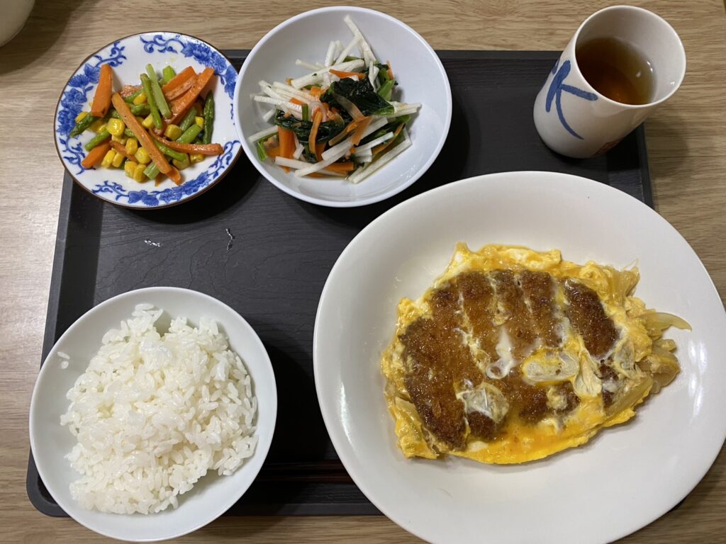 2025/12/03 夕食 ごはん カツ煮 アスパラとコーンバター炒め 大根サラダ