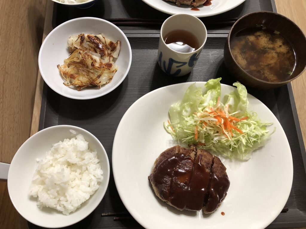 2025/12/05 夕食 ごはん 味噌汁 ハンバーグ サラダ ちくわと玉ねぎのからし醤油炒め